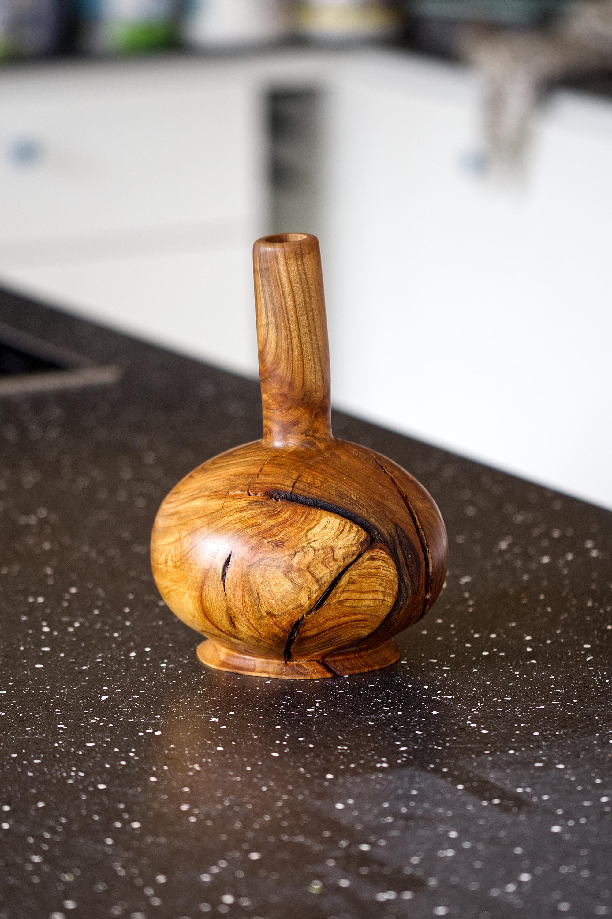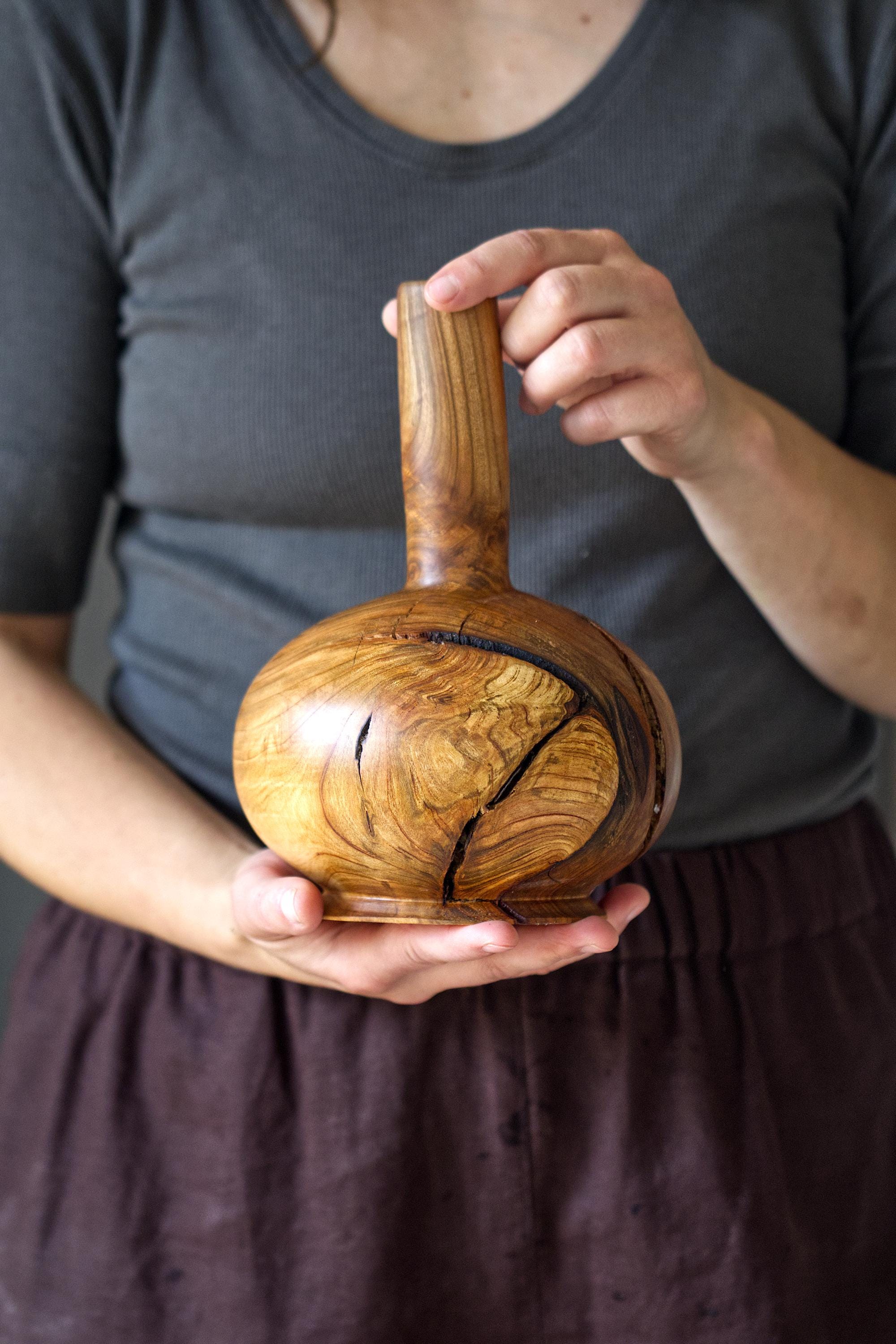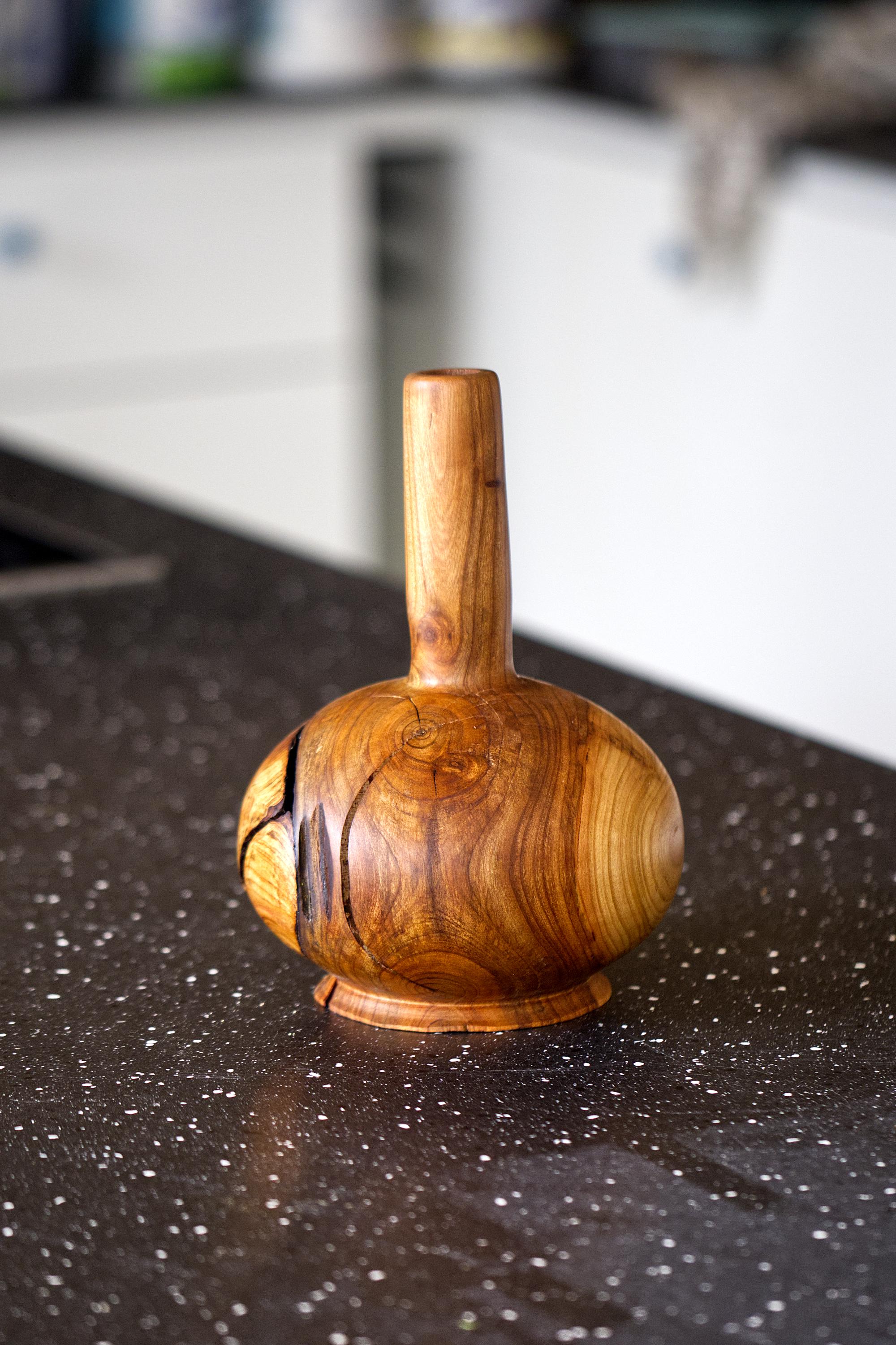 Enhance your home with the warmth of natural wood through this handcrafted cherry wood vase. This unique piece highlights the organic beauty of solid, high-quality cherry wood, showcasing its rich grain and natural imperfections.