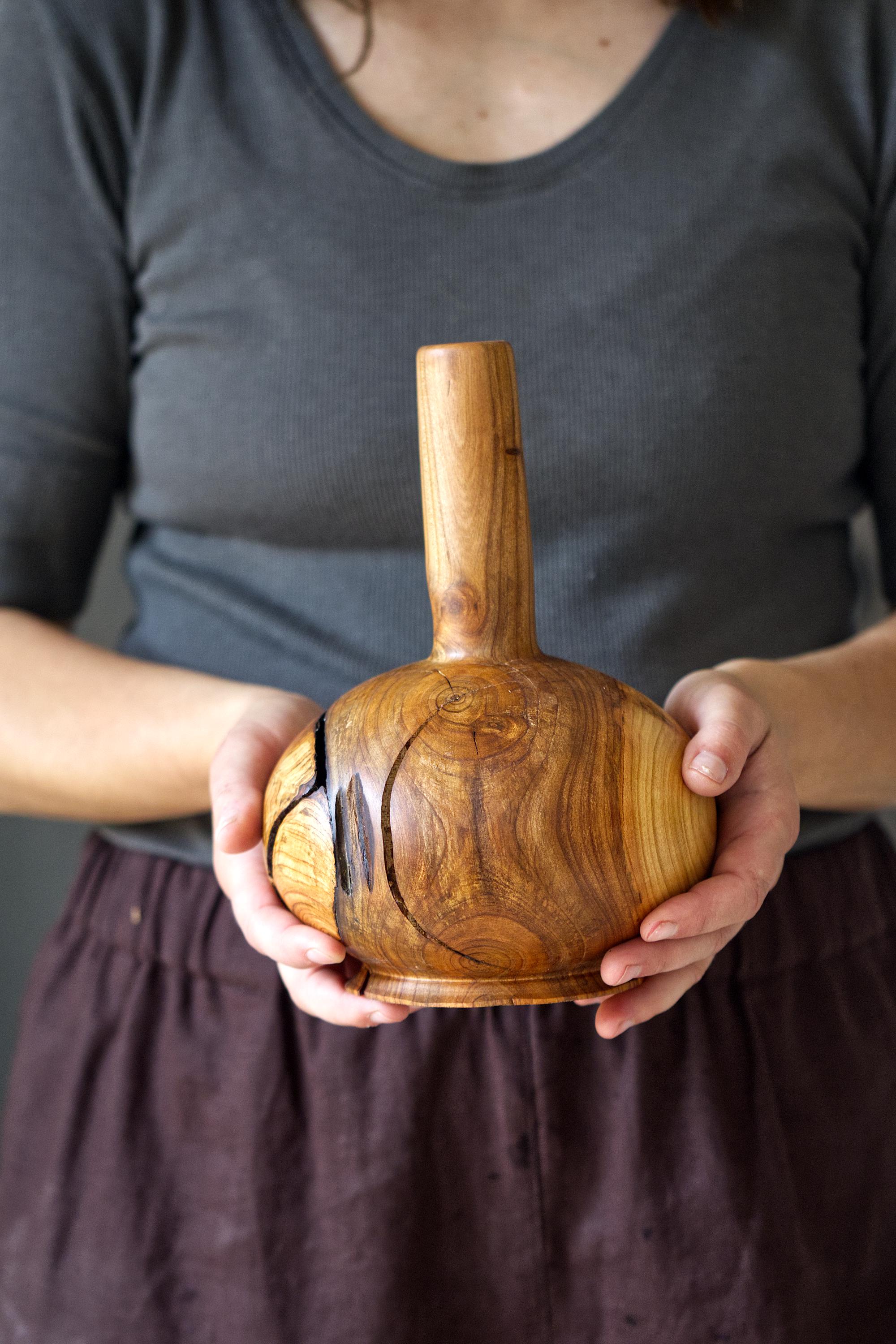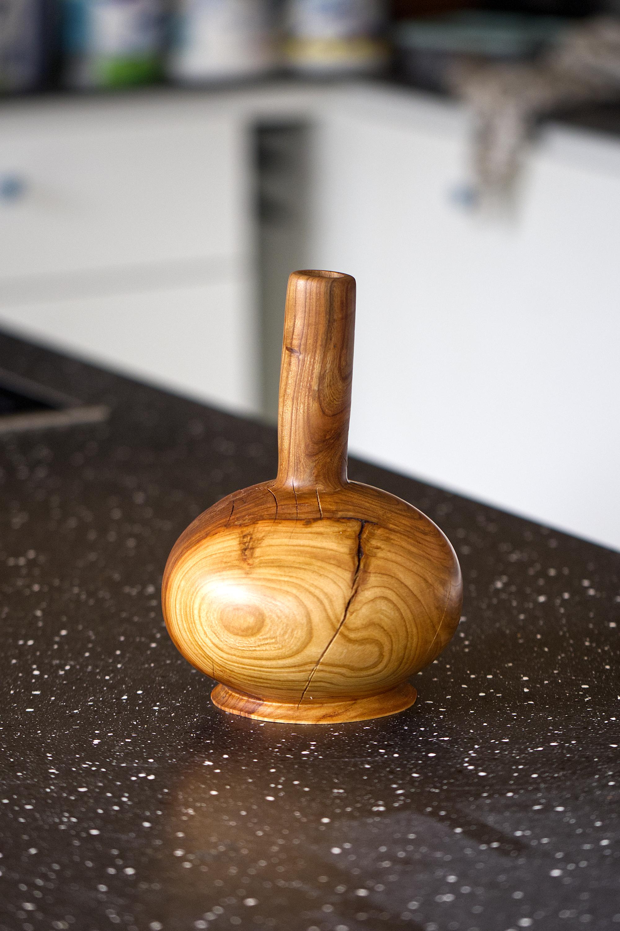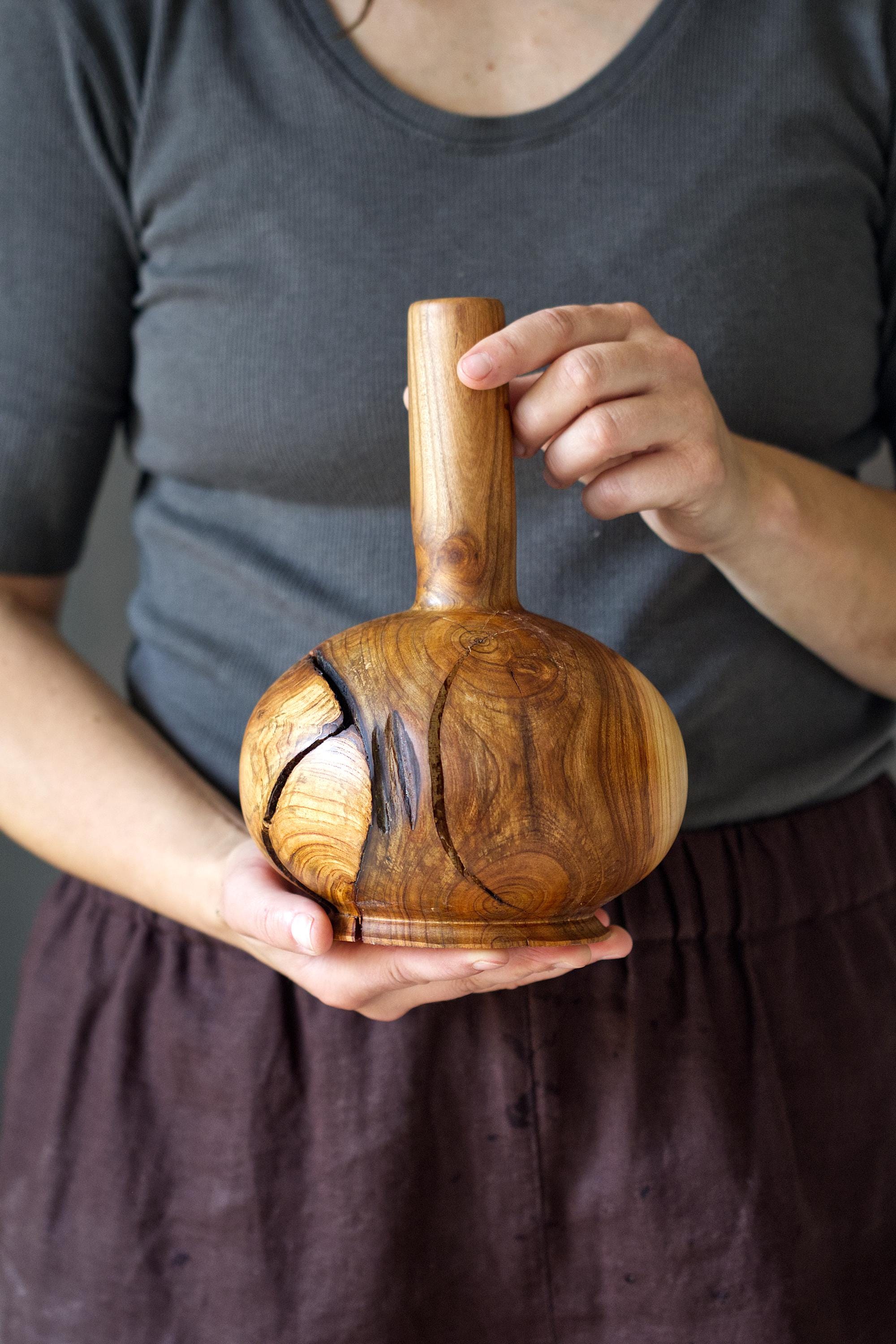 Enhance your home with the warmth of natural wood through this handcrafted cherry wood vase. This unique piece highlights the organic beauty of solid, high-quality cherry wood, showcasing its rich grain and natural imperfections.